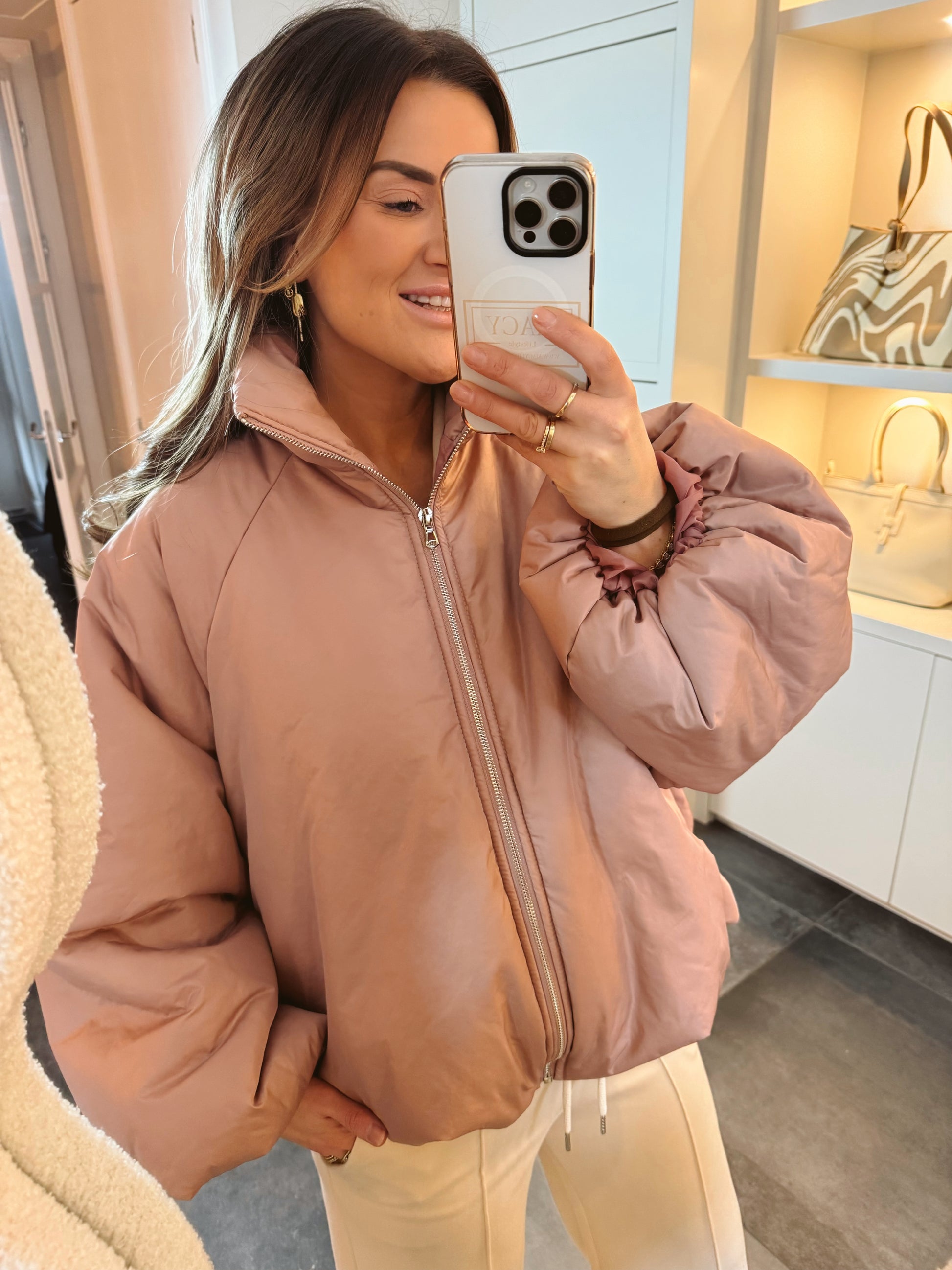 Heerlijke tussenjas met pofmouwen en een opstaande kraag.